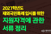 재외국민교육정보 입시연구소 | ACSA 입시컨설팅 재외국민특별전형 2027학년도 대학 입시가 7월로 다가옴에 따라 입시를 준비하는 수험생과 학부모들의 움직임이 분주해지고 있다. 해마다 재외국민 전형의 서류 준비는 지원 자격의 엄격함과 서류 준비의 복잡성으로 인해 미리 준비하지 않으면 입시에 어려움을 겪는 경우가 종종 발생하곤 한다. 단순히 서류를 제출하는 것을 넘어, 지원자의 해외 거주와 수학 사실을 행정적으로 증명하는 과정이 핵심이다. 특히 주요 대학들의 2026학년도 대비, 2027학년도에는 학교폭력 기록 반영 등 더욱 엄격한 잣대가 적용될 전망이다. 7월 서류 준비가 고민이라면? 지금 바로 상담신청! 상담 신청 바로가기 1. 학적 증빙학적 서류는 지원자의 해외 수학 기간과 학제 이수 여부를 확인하는 기초 자료다. 초·중·고교 전 과정의 기록이 요구되며, 특히 중·고교 과정의 연속성이 핵심 평가 요소로 작용한다. 학적 증빙 서류 상세 지침※ 해외 발급 서류는 아포스티유 또는 영사 확인이 필수임초·중·고교 재학증명서입학·전입·전출일이 연/월/일 단위로 정확히 기재되어야 하며, 학년 및 학기 표시가 필수임. 원본 제출이 원칙이며 한국 학교는 생기부로 대체 가
