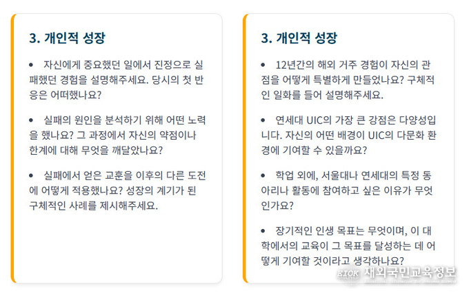 전략: 이 문항들은 서구권 대학의 입학 에세이와 유사하다. 리더십, 다양성, 개인적 경험에 대해 깊은 성찰을 요구한다.