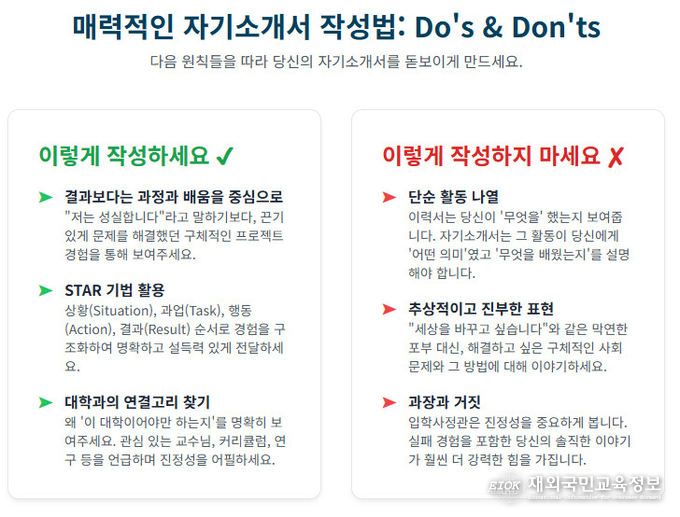표절 및 대필: 대학은 정교한 유사도 검사 시스템을 활용한다. 자기소개서는 100% 지원자 본인의 창작물이어야 한다.